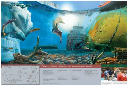 Five large format posters of Rockman’s Great Lakes Cycle murals, with keys to the artwork, are also available for classroom use on a first-come, first-served basis. Each poster is 2' x 3' and includes a full color print of a painting with a line drawing key to the image (as in the sample below). Please contact biology@nmu.edu and ask about "Rockman educational posters."