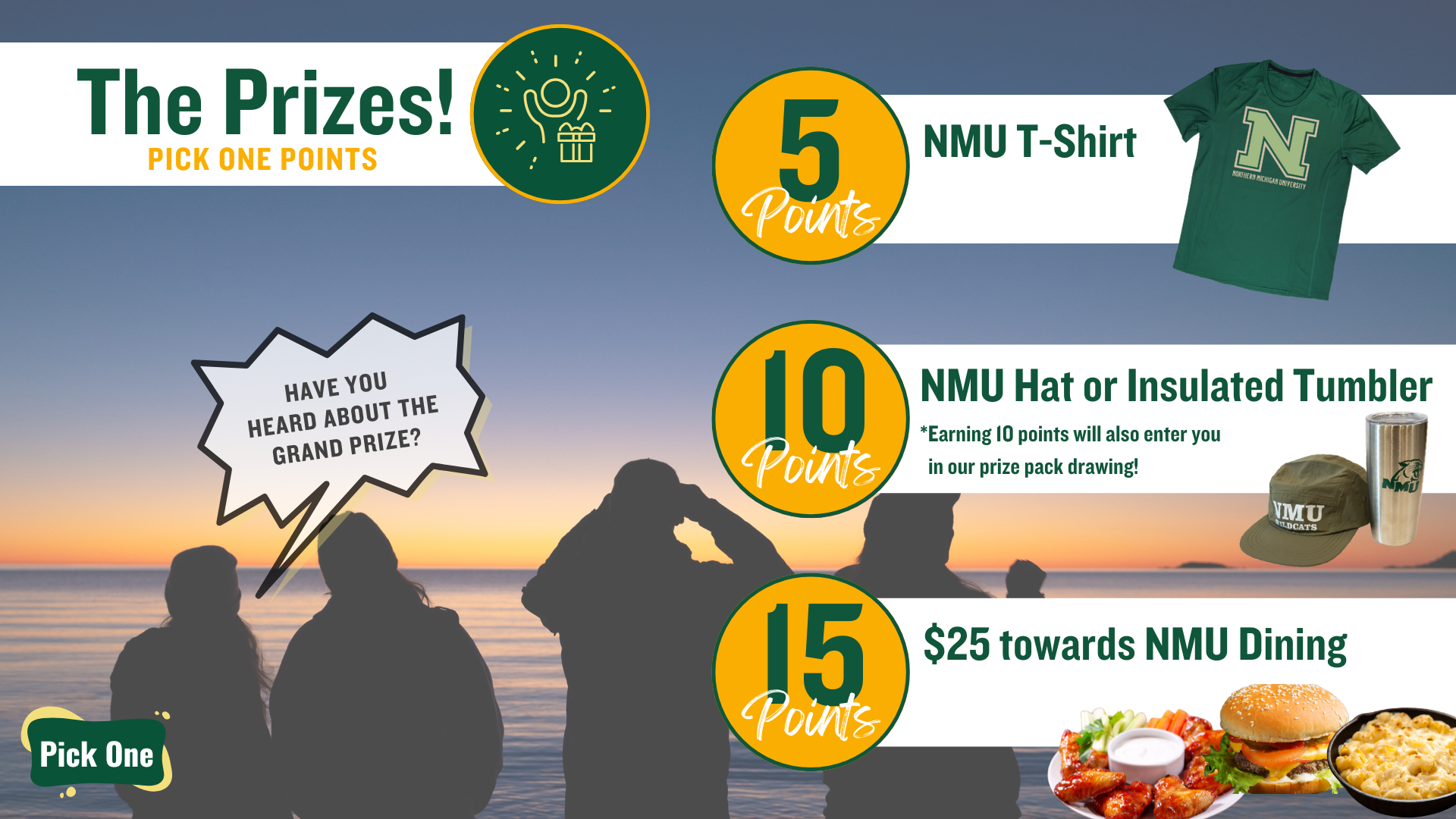 The Pick One promotion encourages NMU students to find at least ONE thing that connects them to the campus community to build their sense of belonging at NMU! Through Pick One you get involved, attend events, earn points and get rewarded with prizes. This is a great way to explore campus during the first six weeks of school, build connections, gain friendships and get access to endless opportunities.