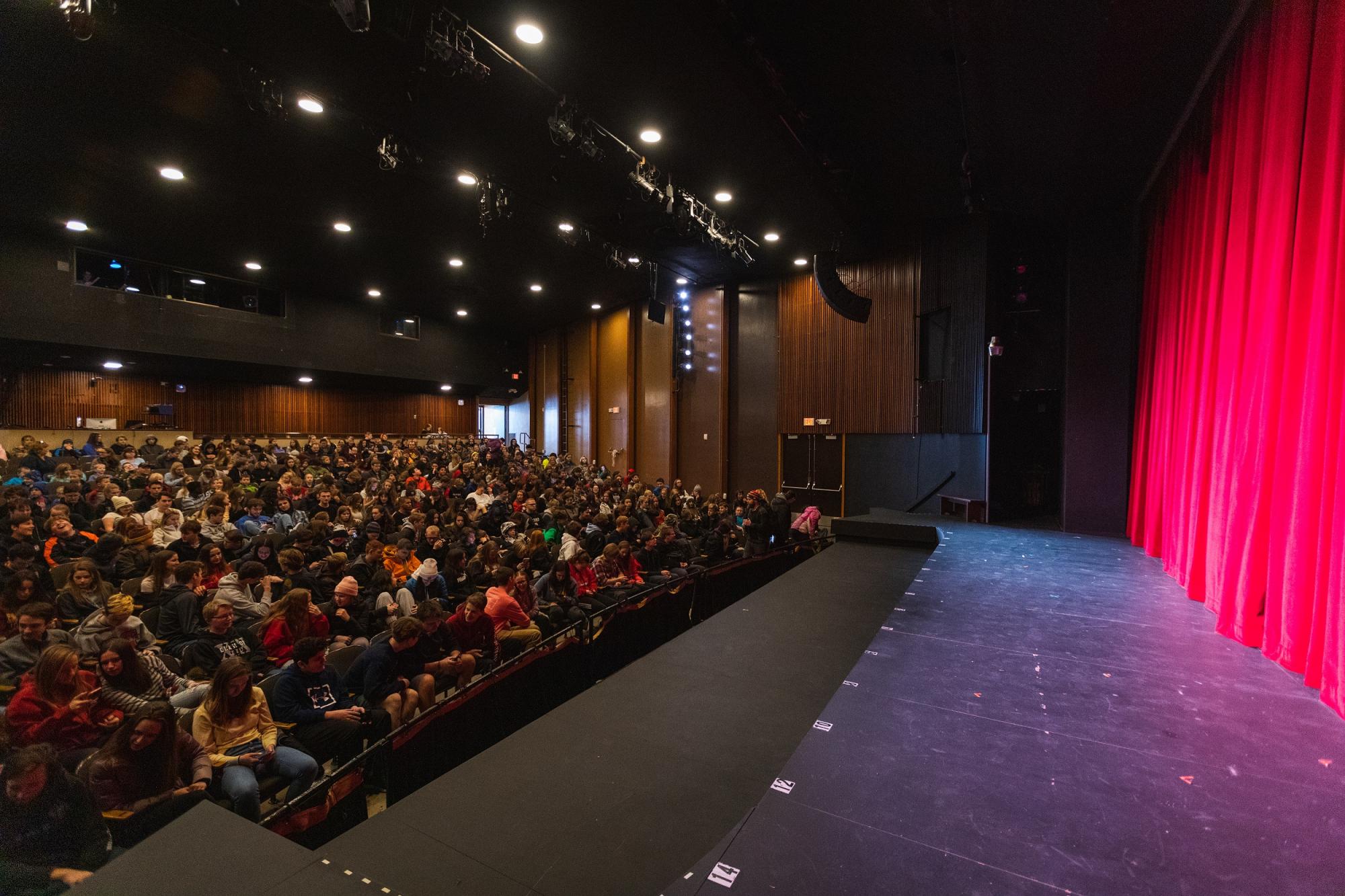 The Forest Roberts Theatre is NMU's mainstage theater and the first of two playing spaces located on our campus! It seats about 515 people and is typically where musicals and larger plays are performed. In the past few years, productions such as Mamma Mia!, Sweeney Todd, Noises Off, The Addams Family, Chicago, Little Shop of Horrors, and Les Miserables have been performed in this space. The lower part that you can see at the front of the stage is a pit space that can be covered or uncovered depending on the needs of a specific show. The FRT is a fairly versatile space and has many capabilities; during Les Miserables, for example, the entire barricade was lifted up from the green room directly underneath the stage! The FRT also gets rented out for several events throughout the year, including Superior Arts Youth Theatre productions and NMU Music Department concerts and film showings.