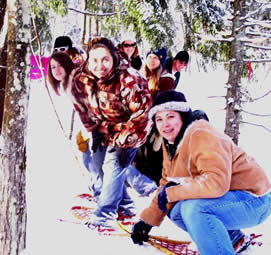 The NMU group stayed at a culture camp on Sugar Island, located on the St. Mary’s River between the Upper Peninsula and Ontario. Participants are pictured during a snowshoe outing near the camp. While most of its residents are tribal citizens, Sugar Island is not recognized as reservation property. Both the Sault Tribe of Chippewa Indians, which owns the camp, and the Bay Mills Indian Community have interests on the island. The group took a ferry back and forth to the Soo for their activities at Bahweting. In addition to classroom activities, NMU students participated in cultural events.