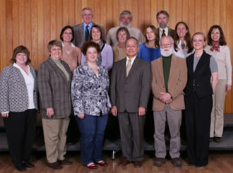 contributed to the development of the Superior Edge initiative and the implementation of President Wong’s "Road Map to 2015." Members present at the luncheon were (front left to right with Wong): Kia Jane Richmond (English), Carol Steinhaus (Business), Elizabeth Monske (English), Charles Ganzert (CAPS) and Leslie Cory (Technology and Occupational Sciences); (second row) Judith Puncochar (Education), Katy Morrison (Center for Student Enrichment), Mary Ellen Powers (Nursing), Heidi Stevenson (HPER), Rachel Harris (Center for Student Enrichment) and Nell Kupper (Modern Languages and Literatures); (back row) Dave Bonsall (Center for Student Enrichment), Paul Duby (Institutional Research) and Ronald Sundell (Geography). Other board members not pictured are Michael Andary (Technology and Occupational Sciences), April Lindala (Center for Native American Studies), Terry Seethoff (Arts and Sciences), Walter Niebauer (CAPS) and Sandra Poindexter (Business).