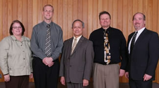 A group that implemented a project allowing students to charge textbooks to their personal accounts received the TLC staff award for innovative use of technology. To offer the service at the NMU Bookstore, student data needed to be downloaded from Banner into the Bookstore’s PRISM point-of-sale system, then the transaction had to be transferred back to Banner for billing. The group set the goals and parameters, solved problems and wrote policy for the interface that was needed to accomplish this service. Students benefit because they don't have to wait until funds arrive, allowing them access to books at the start of the semester. Also, the service is more convenient and decreases checkout time during the NMU Bookstore's most hectic period. Members of the group were (pictured from left with Wong): Nancy Anderson (Financial Services), Brian Larson (AdIT), Steven Bigalk (Financial Services) and Paul Wright (NMU Bookstore).