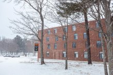 A red brick building with many windows stands amid leafless trees during a snowy winter day. Snow covers the ground, and parked cars are visible in the background near a black and orange campus sign.