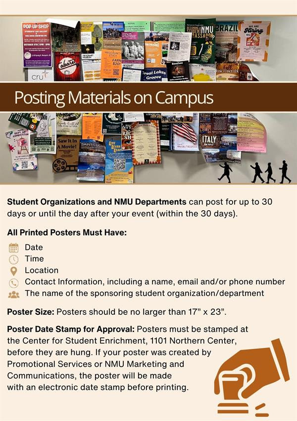 B. Registration of posting material is an indication that the material meets the requirements of the Posting Materials Policy. It is not in any way intended to imply that an activity or event being publicized is endorsed by Northern Michigan University or the Center for Student Enrichment or Marketing and Communications.